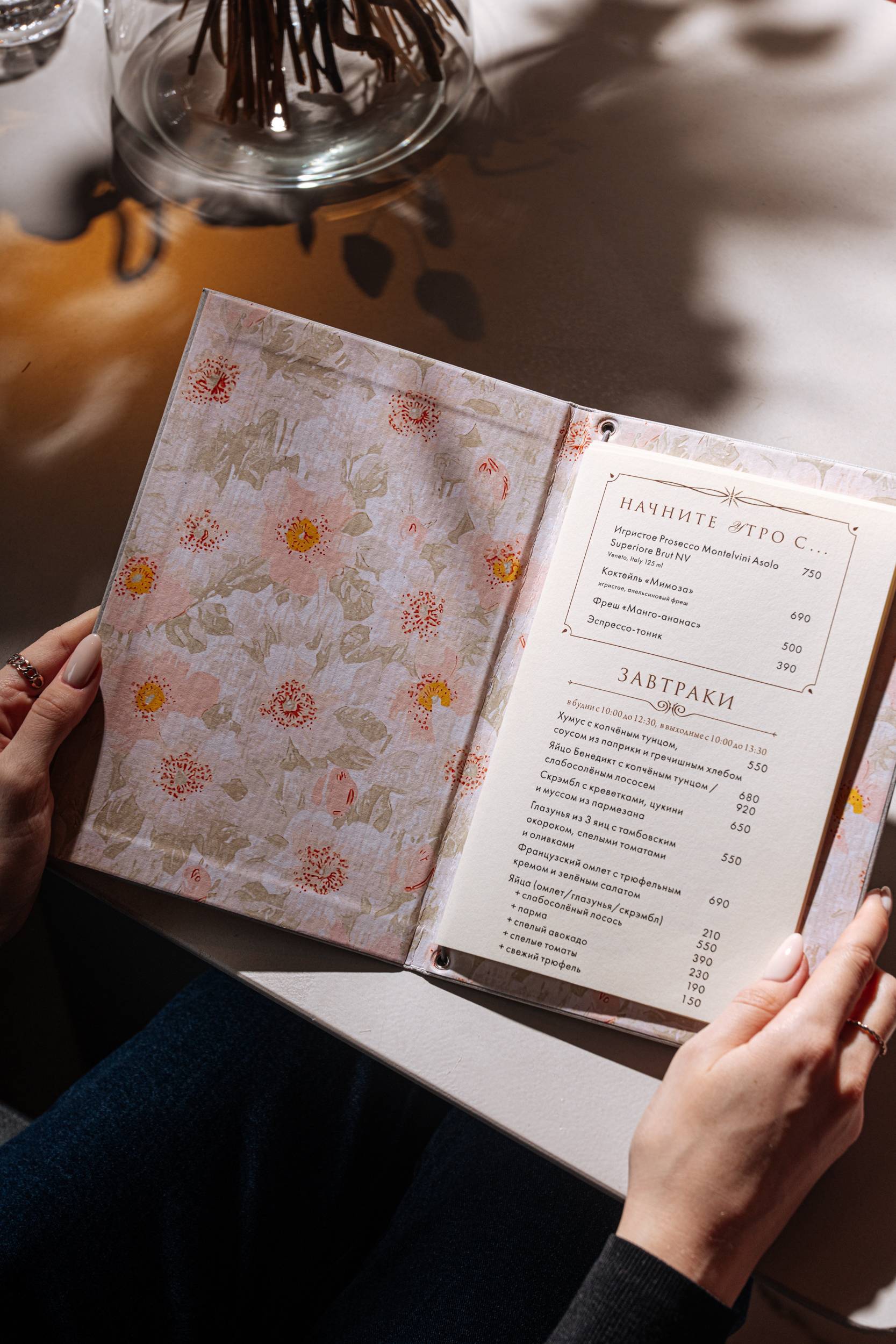 В основе идеи – использование единой цветовой палитры в интерьере, форме и посуде, интеграция культурного наследия города и символов футуризма (узоры в элементах фирменного стиля повторяют узоры с колонн Лоджий Рафаэля, построенных по заказу Екатерины Великой, решетки Михайловского сада у Спаса На Крови, а также обложку первой книги русских футуристов «Садок судей II»).